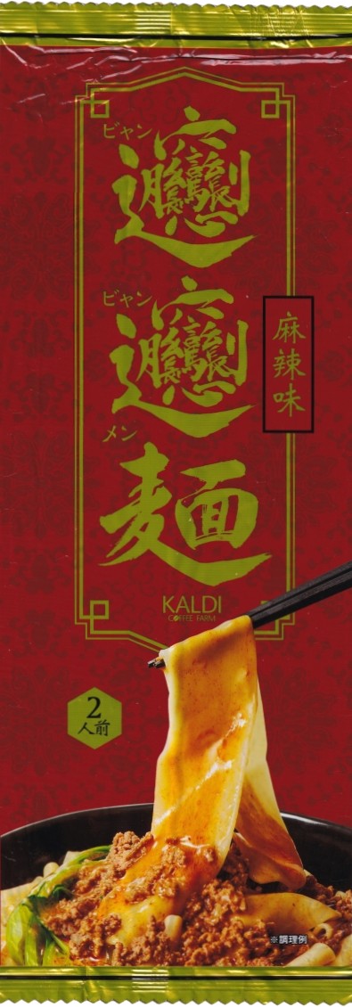 | ほうとうのような平麺で、まぜ麺式の食べかたです。長さが乾麺の状態で22cm・幅が2cmもあり一食分が十二本というか十二枚というか、わりと特殊な商品ですね。天地サイズが37cmの巨大パッケージになっています。それよりもやはりその名称に話題性があり、本国でも最も画数の多い漢字の麺料理として知られているようです。もちろんJISコードには無い字ですが2020年にunicode