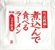 | 箱のサイズが165ミリ×180ミリという正方形に近い形に改められました。中の麺の個包装は座ぶとん式に重なって入っていて、箱の厚みは60ミリあります。正方形ということは縦横の区別がなくなりますから、2000年ヴァージョンのように反対面にもパッケージデザインを施す必要がなくなるわけですね。裏面に作りかたの説明や原材料名表示などが入っています。いっぽう今度は側面部分を使って、平積みなどのさまざまなディスプレイに対応できるようにしてあります。 |