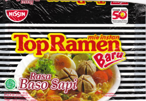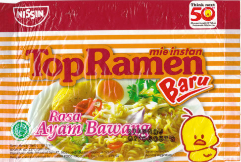 インドネシア版は62グラムとコンパクトです。なぜかチキンラーメンという表記はどこにもありません。ひょっとしたら他社ですでに使われていたのかもしれません。Rasaは「味」、Ayamが「鶏」、Bawangが「玉ねぎ」の意味だそうですから、チキンオニオン味ということになりますね。Baruは「新しい」の意で、「New!」といった感じで添えられています。同国では「トップラーメン」は以前から発売されていたそうで、その新製品という形で発売されたということでしょう。50周年記念のマークが付いたものとしては、「Rasa