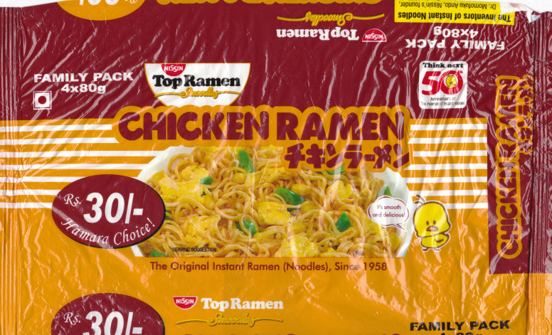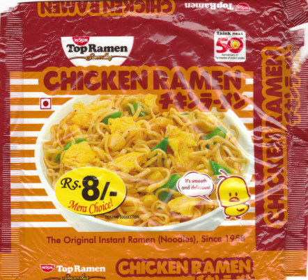 Packはミニラーメンで45グラム入り。「Top Ramen」のロゴもありますから、インドではもともとトップ・ラーメンというブランドでラーメンを発売していたんでしょう。 |