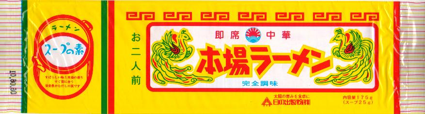 数箇所に手直しが入っています。 商品名ロゴ上のシンボルマークの左右に配置されていた「即席 元祖」が「即席 中華」に、下部のメーカー名表示のところにあった「本場ラーメン本舗」は「太陽の恵みを食卓に」というコピーに差し替わっています。また「本場ラーメン本舗責任謹製」のコピーは削除されてしまいました。