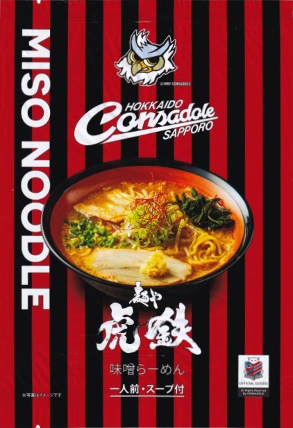 札幌のラーメン店・麺や虎鉄のオリジナル商品です。サッカーの北海道コンサドーレ札幌の公式グッズという体裁もとってあり売上金の一部をチームの強化費に充てているらしいです。虎鉄の大将がコンサドーレファンなんでしょう。2023年に発売された当初はチームのエンブレムを全面に描いたパッケージデザインで、これは入手できませんでした。2025年3月にこの新デザインに変更されています。アルミ袋です。