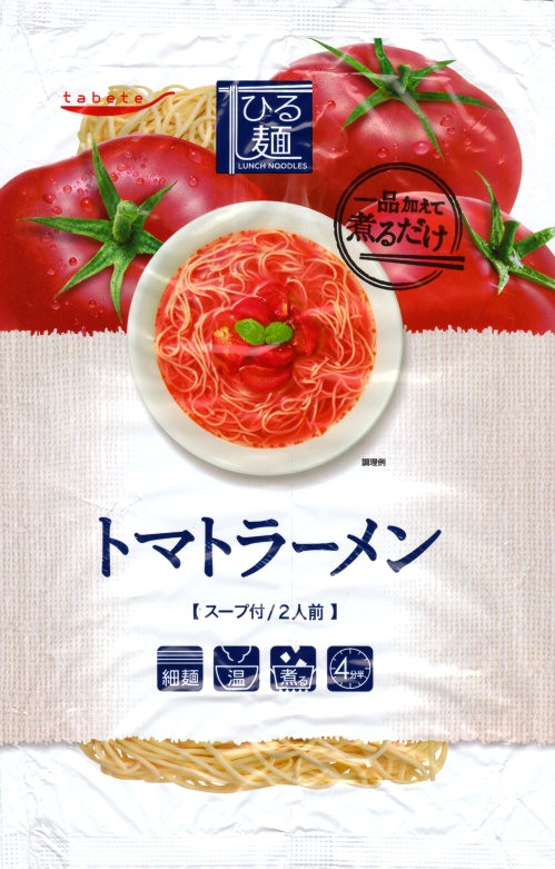 このシリーズ、商品名はそれぞれ非常に説明的で、そのためえらく長い名称になってます。 ところがこのトマトラーメンだけはただの「トマトラーメン」。作りかたからいくと「トマトを加えて煮込むトマトラーメン」になるんですが、トマトの字が重複するのを避けたものと思われます(笑)。