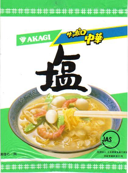 塩味はアカギが製造していたころにもこれと同じパッケージで出ていたようです。大山正弥氏の「即席麺カタログ」(グラフ社・96年)に載っています。